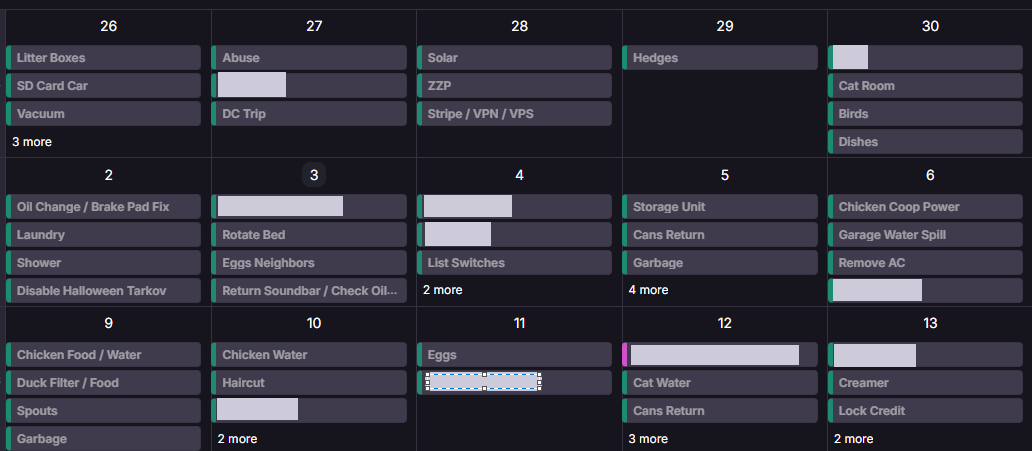 This system, unfortunately, rewards not doing things. This paradox has confounded me for years. Yes, I want to track work, but if the desired state is that everything is done, then the undesirable state is not having everything done, and the fastest way to game that system is to do nothing! And no, I don't have the willpower to just make that not happen. I'm sorry, I don't, I am a flawed person. Ugh. So that means this whole calendar thing, while it continues to work, is going to need an overhaul to avoid this. I have done little tricks here and there to extend its life, but they don't really solve the underlying root cause. Like as an example, I use procrastination to my advantage. If there's something I really, REALLY do not want to do, I will go do other things in its place that need to get done until that task I don't want to do is the last thing left. It's a really funny psychological trick I play on myself. You can even just postpone that bear of a task for the next day, confident that you got a billion other things done just to not have to do it as a reward mechanism. But again, it shouldn't HAVE to be this way. I don't quite know how to deal with this problem.