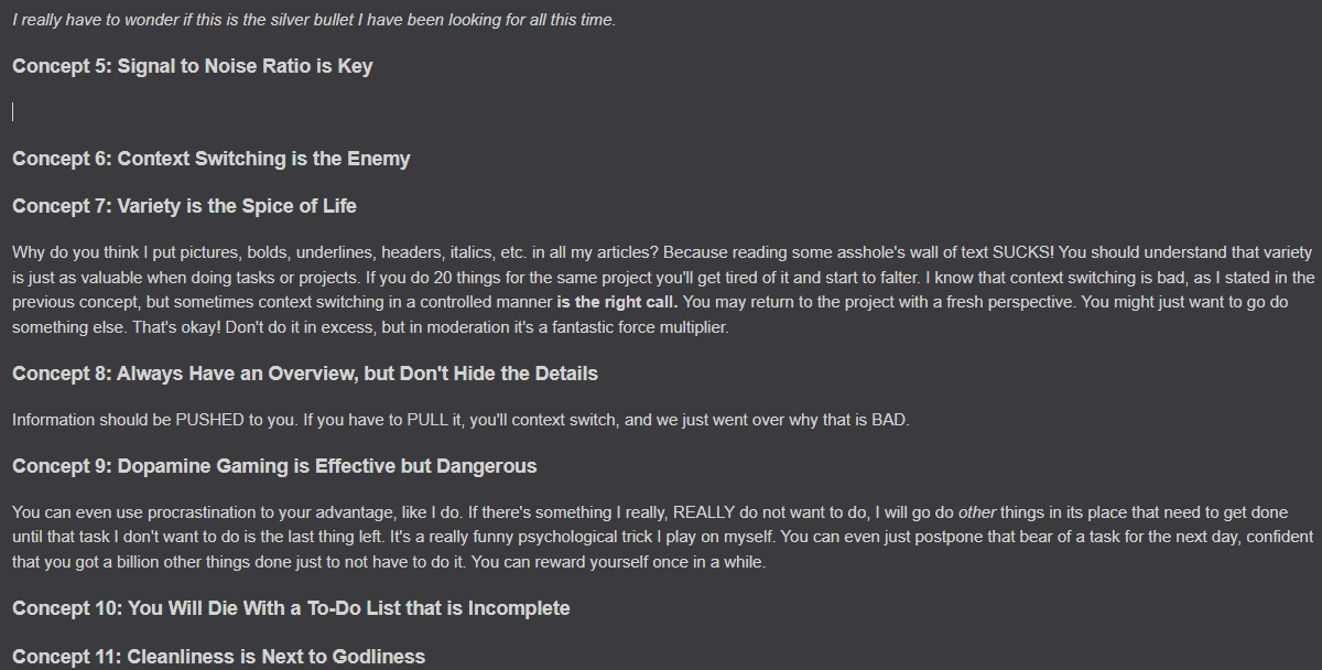 Okay, first up. A table of contents. You ever wonder why I do that in my articles? It's because it organizes my thoughts into clearly distinct "threads". So while writing a big fat article like this might seem daunting, if I can break it down into parts or headers, that gives me jumping off points to work with which I can further digest and start working on. I simply cannot stare at an amorphous body of work and motivate myself to do any of it. An incredibly key pre-requisite is planning, quantification of work, sequencing of events, and so on. This works really incredibly well for me. It's one of the first things I started doing. If I can visualize a problem and its components it becomes clear. When writing this article, I took all the concept headers and wrote them first. That's how I stayed on track. Yes, I may have changed a few over the course of writing this, but at least I got that part right. You want proof? Here! This is what this article looked like at about 50% completion. I was all over the place, but I had the structure, and it let me be completely freeform while keeping me on the right path.